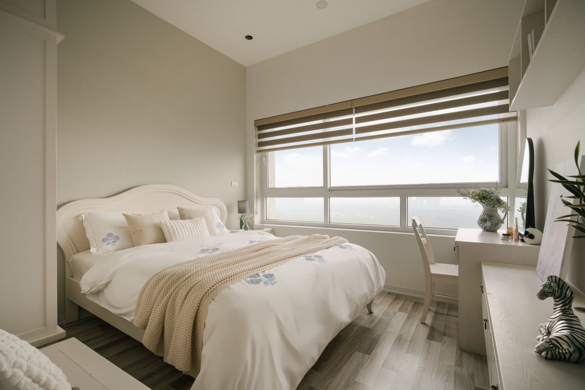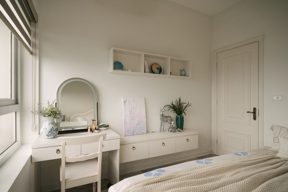 Phòng ngủ phụ: tone trắng, điểm nhấn gỗ nâu, thiết kế tối giản.