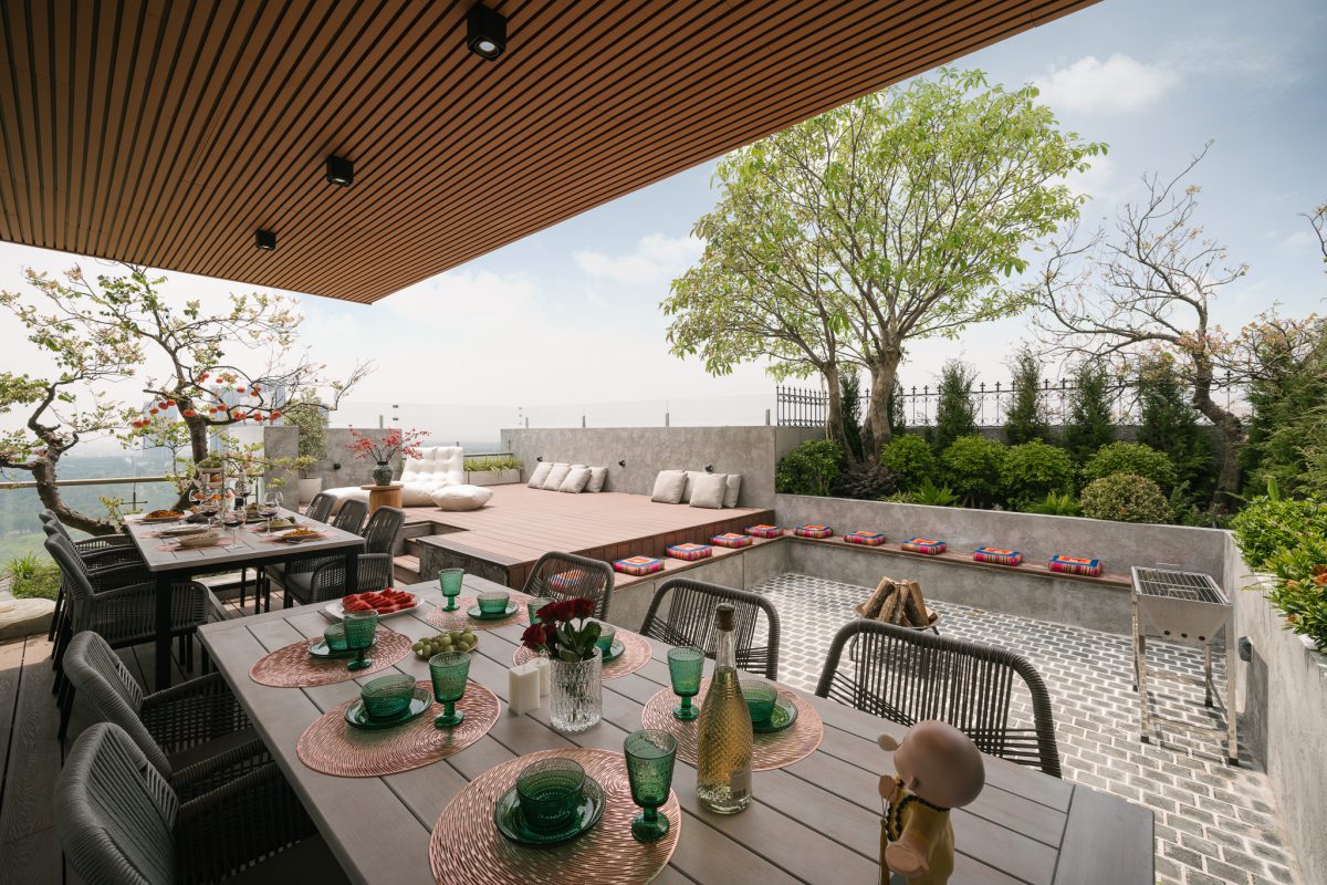 Sân thượng: nhiều vùng chức năng — BBQ, khu ngồi, vườn nhỏ.
