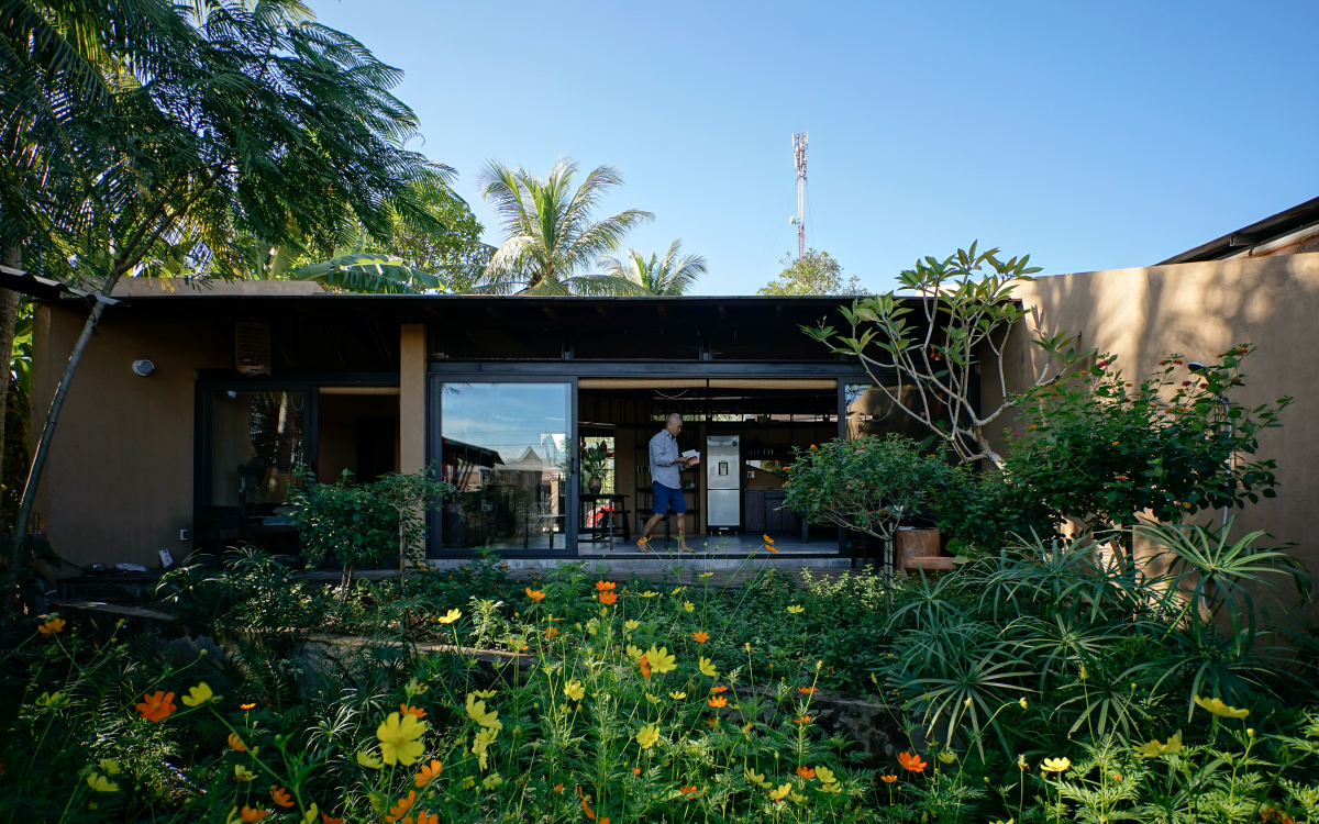 Không gian mở giữa nhà — vườn — chòi tạo sự kết nối liên tục với thiên nhiên.