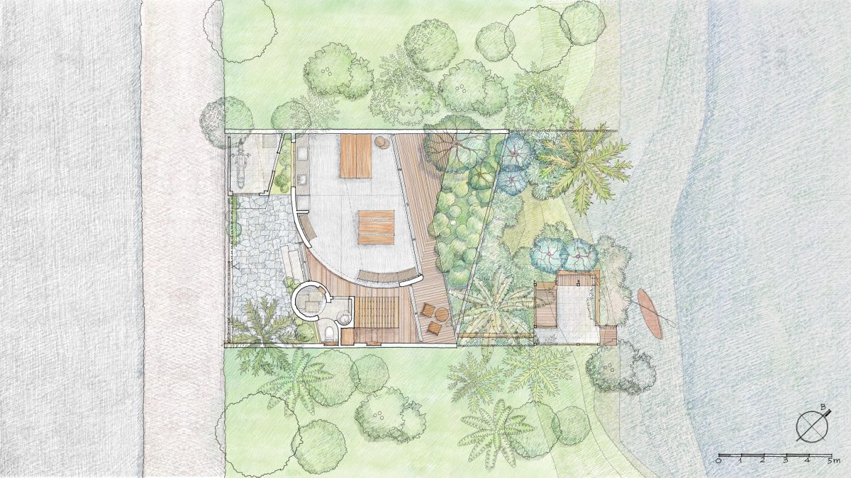 Bản vẽ thể hiện bố cục hợp lý, các khu chức năng được sắp đặt theo hình cong mềm mại, không gian mở, giao hòa giữa nhà – sân – sông một cách mạch lạc và tinh tế.